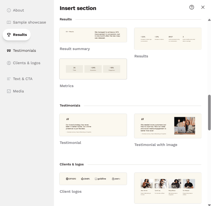 🛠 Pro Tip: Use “Text & CTA” sections as in-between calls-to-action to book a discovery call or view your resume.